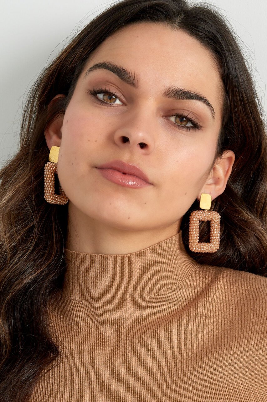Rechthoek oorbellen met glaskralen - koraal
