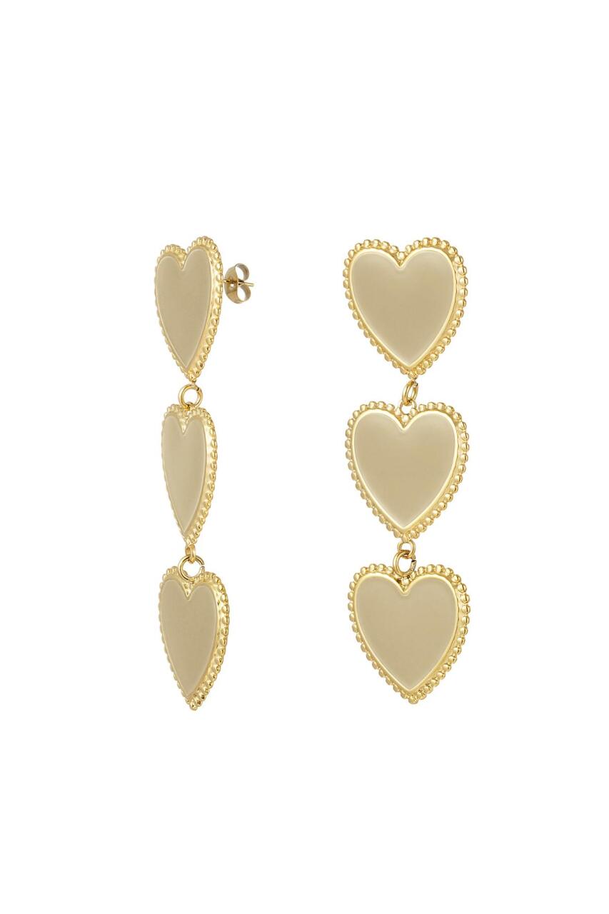 Hoe tof zijn deze gouden statement oorbellen met drie beige sierlijke hartjes op een rij! De oorbellen zijn voorzien van... Read more